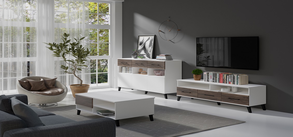 Carlo kolekcijoje yra daug skirtingų elementų, leidžiančių visapusiškai įrengti svetainę. Penkių stalčių komoda ir trijų durų trijų stalčių komoda yra puikūs daiktų laikymo sprendimai, derinantys funkcionalumą ir rafinuotą išvaizdą.