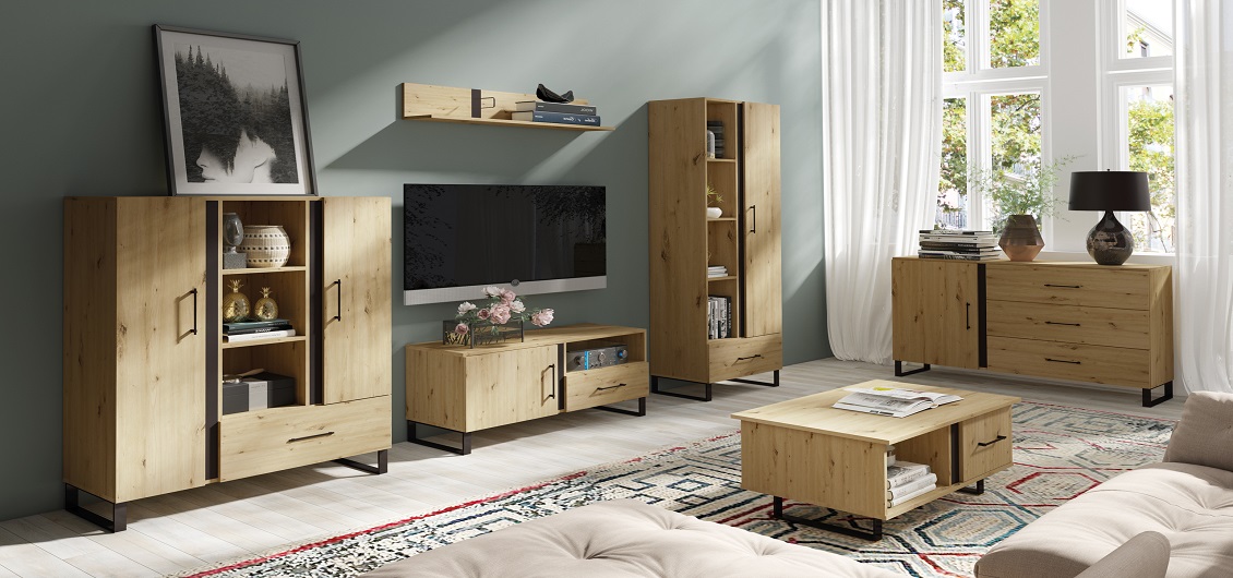 Aukštos kokybės medžiagų naudojimas garantuoja nepaprastą patvarumą ir ilgalaikį naudojimą. Šilto ąžuolo atspalvio dekoras su matinės juodos spalvos elementais suteikia baldams elegantiško kontrasto ir vizualinio gylio. Matinė priekinių dalių ir korpusų apdaila pabrėžia šiuolaikišką kolekcijos charakterį, išlaikytą minimalistiniu stiliumi.