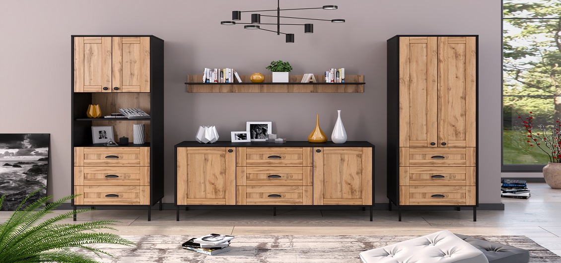 HENRY svetainės baldų kolekcija – tai harmoningas modernios estetikos ir klasikinės elegancijos derinys. Šios kolekcijos baldus, pagamintus iš vientisos laminuotos medžio drožlių plokštės, galima įsigyti unikalaus Wotan ąžuolo dekoro su matiniais juodais akcentais. Matinė baldų fasadų ir korpusų apdaila pabrėžia jų unikalų subtilumą.