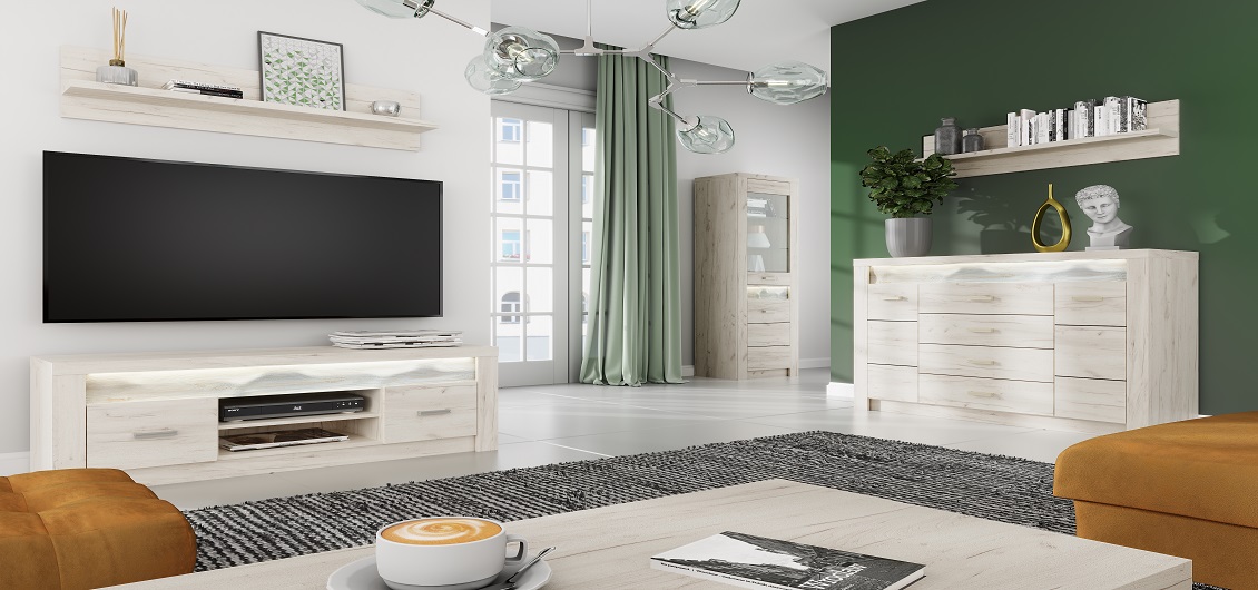 Indianapolio svetainės baldų kolekcija – tai kvietimas į interjerą, balansuojantį tarp modernumo ir klasikinio grožio. Baltas kraft ir matinė apdaila sukuria ramybę ir eleganciją spinduliuojančią aplinką. Indianapolis – tai baldai, kurie ne tik puikiai tarnauja kaip saugykla, bet ir praturtina kambarį nepaprastu stiliumi bei unikaliu identitetu.