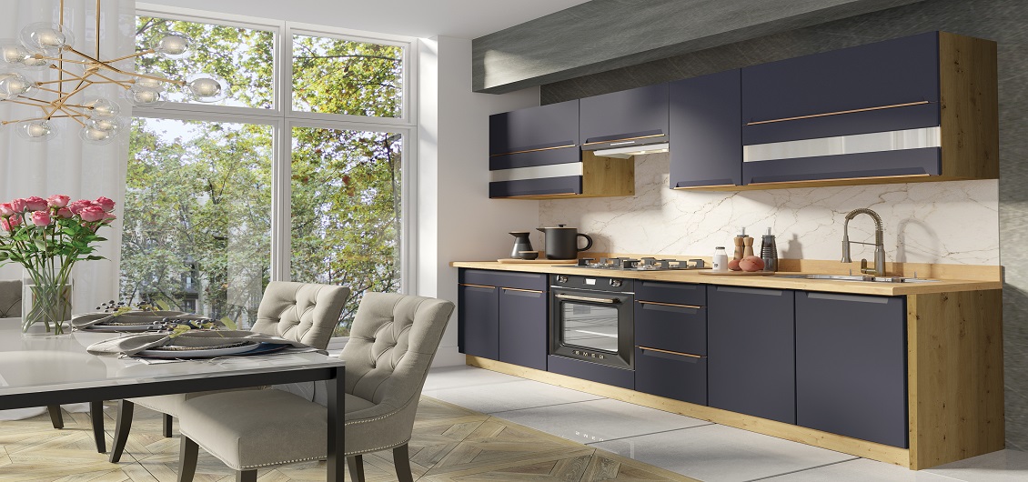 Kolekcija Glamour yra trijų spalvų: žalia, mėlyna ir balta, papildyta amatinio ąžuolo elementais. Šis spalvų ir šilto ąžuolo medžio atspalvio derinys sukuria harmoningą ir malonią virtuvės estetiką.