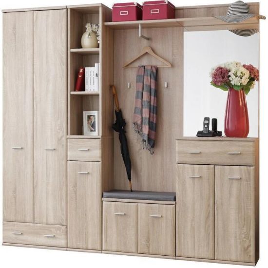Komplektą sudaro: Dviejų durų spinta su apatiniu stalčiumi, skydas su lentyna ir veidrodžiu, spintelė su sėdyne, pakabinamas skydas, spintelė su stalčiumi ir dvejomis durelėmis bei siauras stovas.