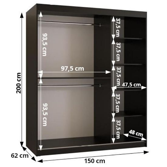 Dviejų durų stumdomų durų sekcijoje siūloma išskirtinė erdvė, atsižvelgiant į jūsų poreikius. Spintos vidus sumaniai suprojektuotas su dviem praktiškais drabužių strypais, todėl galėsite funkcionaliai ir estetiškai sutvarkyti spintą.